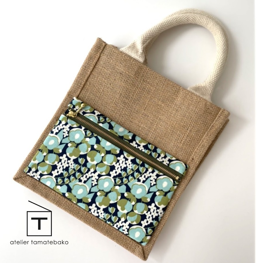市販のジュートバッグに、お好みの生地で縫わずに貼って作るポケットを付ける通信レッスンです。