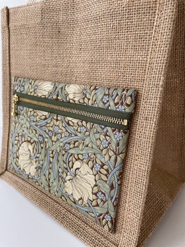 市販されている(無印良品やユザワヤなど)ジュートバッグのお好みのサイズに、自在にジップ付きポケットを縫わずに両面テープで組み立て作ります。